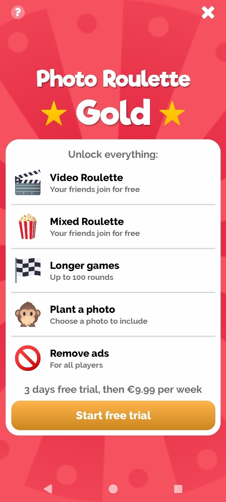 Há também uma versão Gold da Roleta de Fotos, que permite selecionar fotos específicas da sua galeria (em vez de jogar com fotos aleatórias), jogar com vídeos e remover anúncios. Este modo requer uma assinatura semanal.