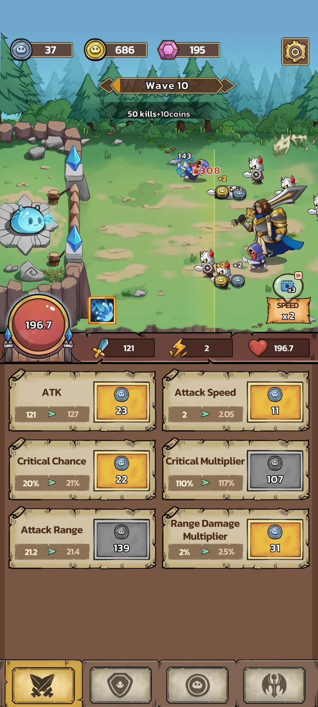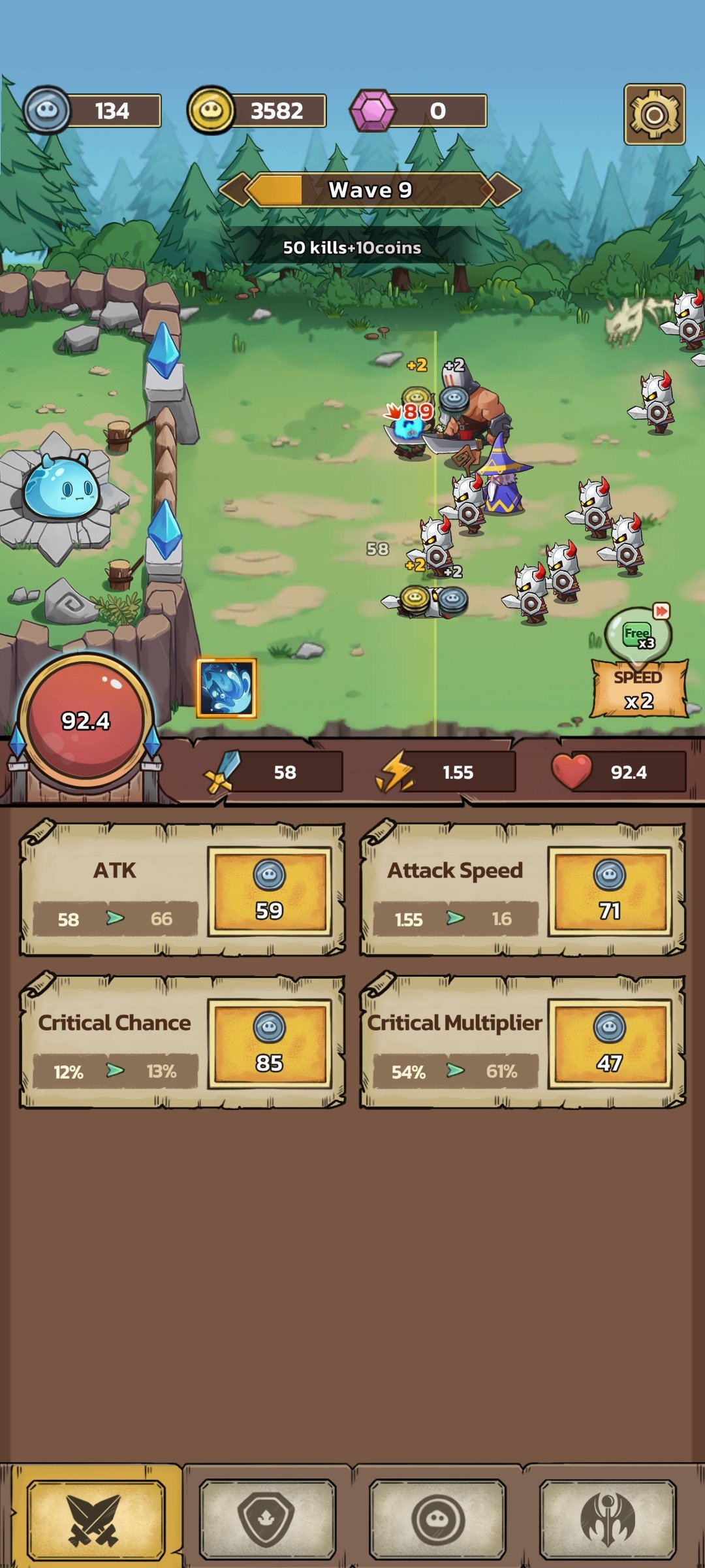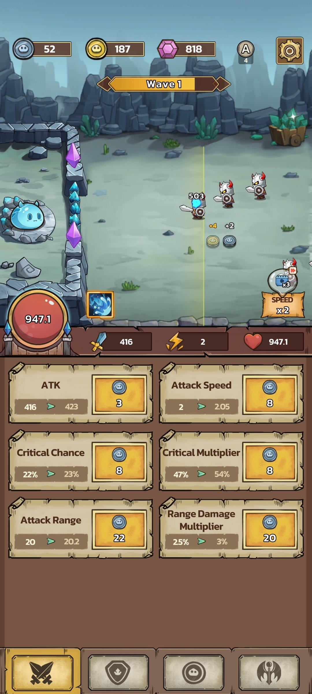 Embora a premissa possa parecer simples, o verdadeiro desafio está em criar a estratégia certa para completar as hordas e avançar entre capítulos. Para resistir, você terá que distribuir os pontos entre ataque, velocidade de ataque, taxa crítica e multiplicador, alcance, defesa, regeneração e habilidades especiais até encontrar a combinação que o leve à vitória. Confira algumas das características de Slime Castle download: