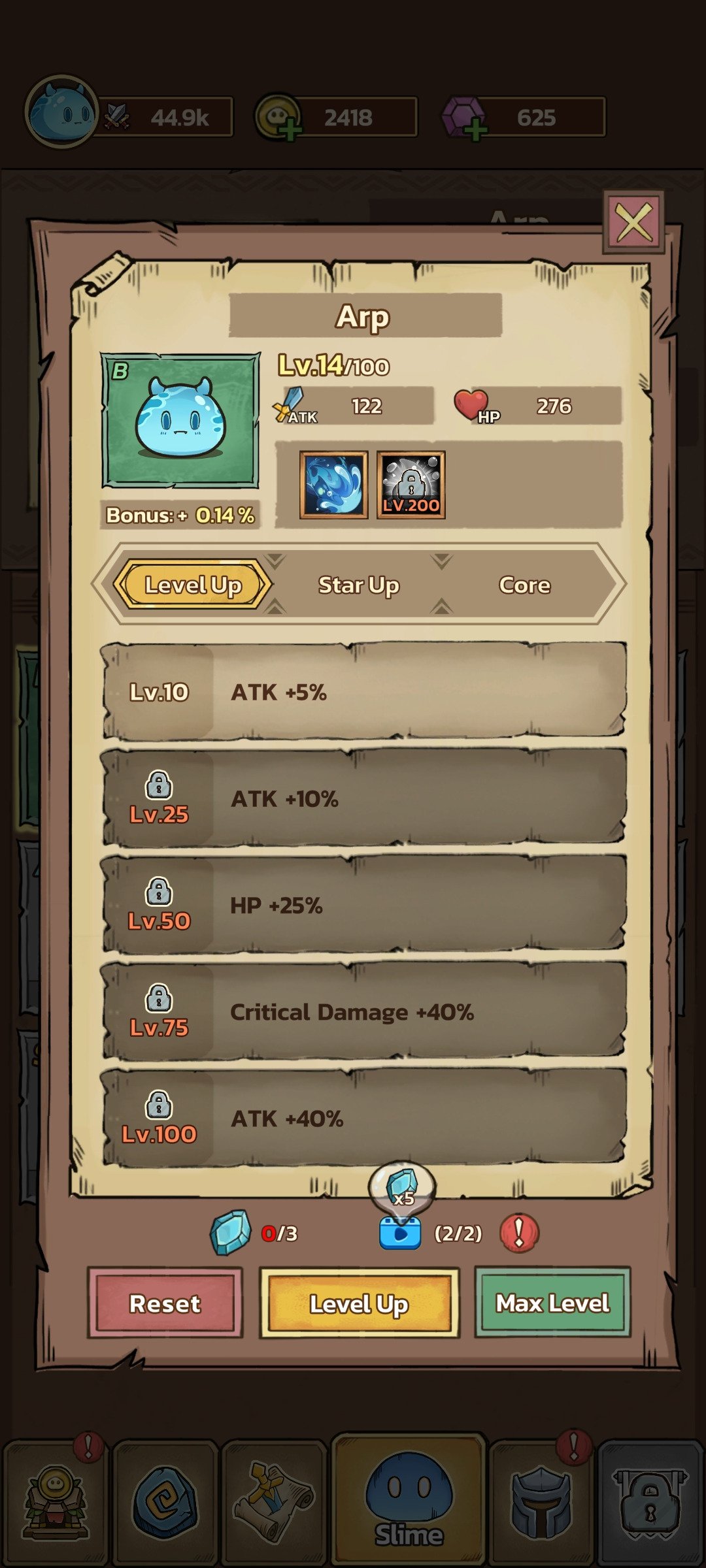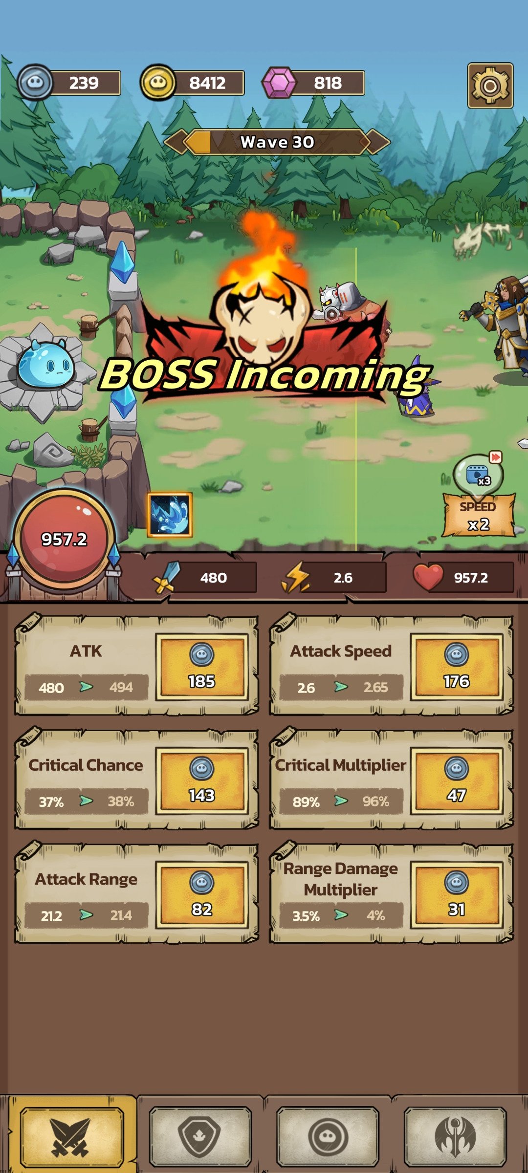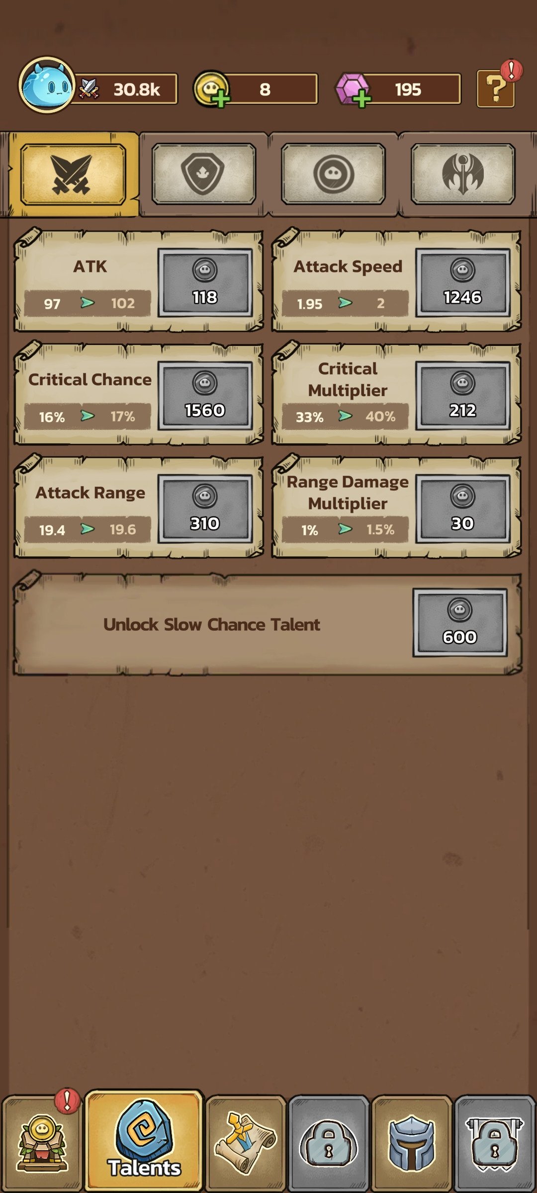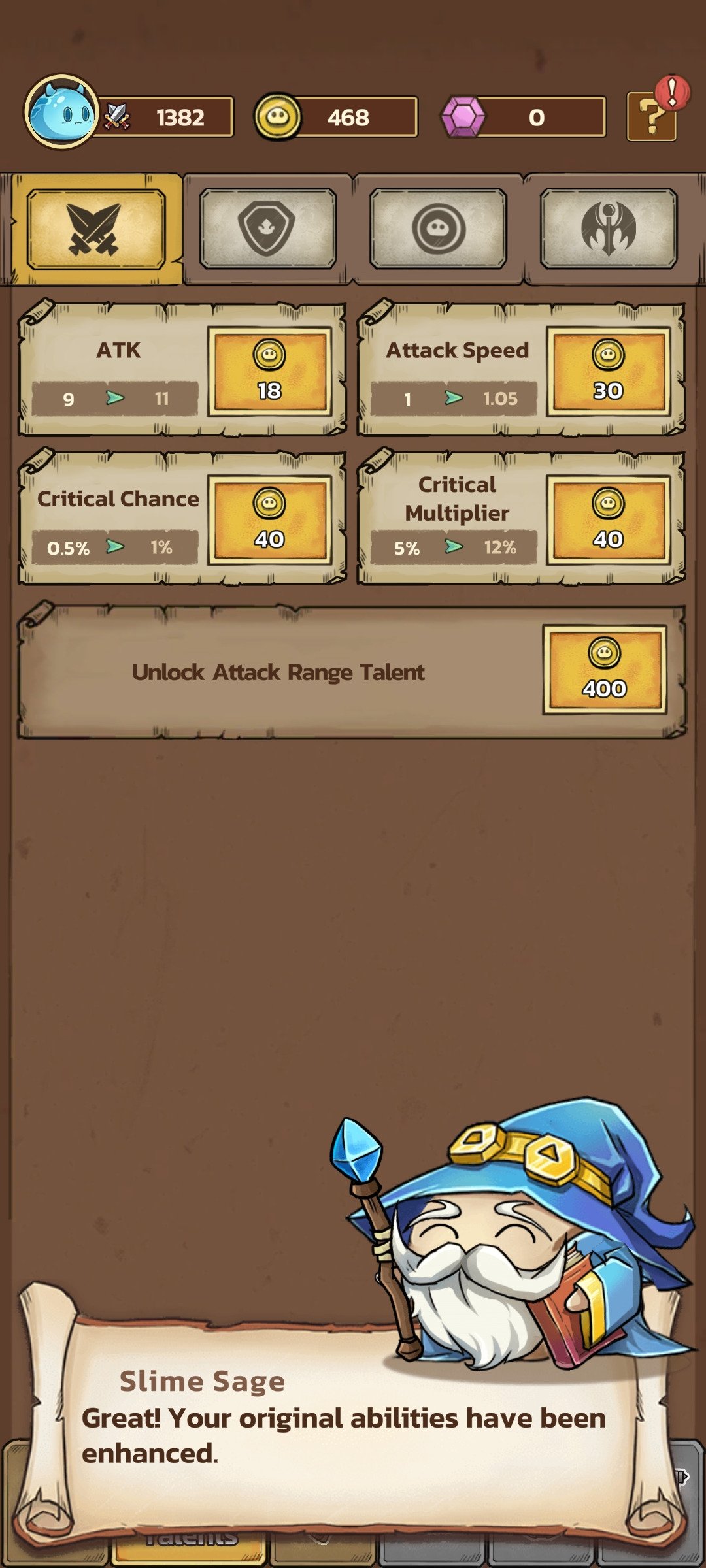 Embora a premissa possa parecer simples, o verdadeiro desafio está em criar a estratégia certa para completar as hordas e avançar entre capítulos. Para resistir, você terá que distribuir os pontos entre ataque, velocidade de ataque, taxa crítica e multiplicador, alcance, defesa, regeneração e habilidades especiais até encontrar a combinação que o leve à vitória. Confira algumas das características de Slime Castle download: