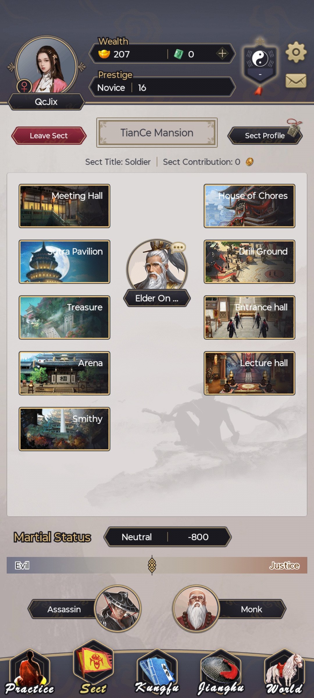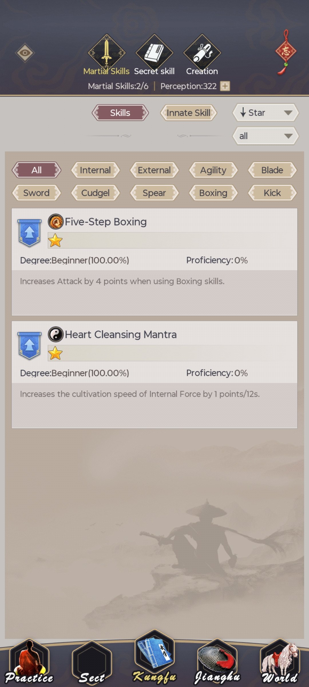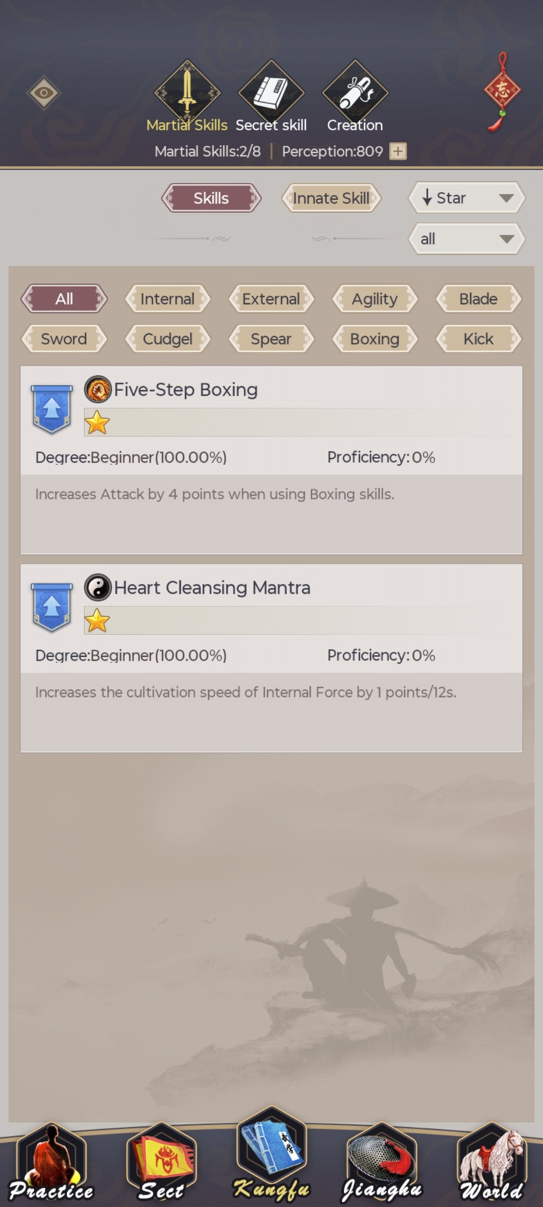 - Progressão baseada em artes marciais e aquisição de conhecimento.
