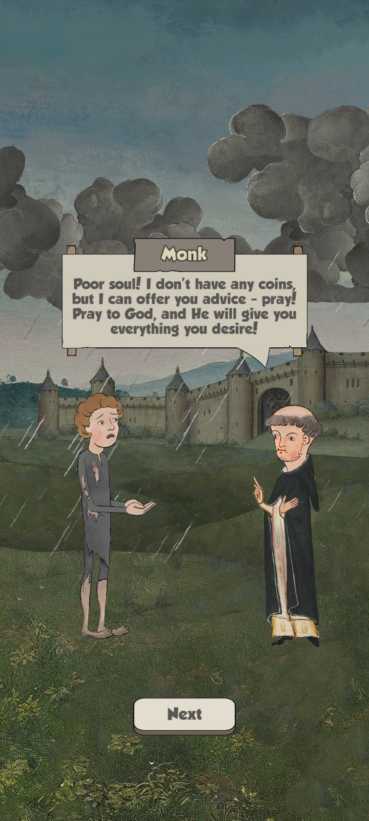 The narrative unfolds in episodes where we will meet playable secondary characters in special chapters: a monk, a terrifying lion, a crazy inquisitor... and even God himself. The humor lies in the absurd logic of the medieval times and constant references to Monty Python. Additionally, this title parodies historical clichés and combines witty dialogues with simplified clicker mechanics and idle progression.