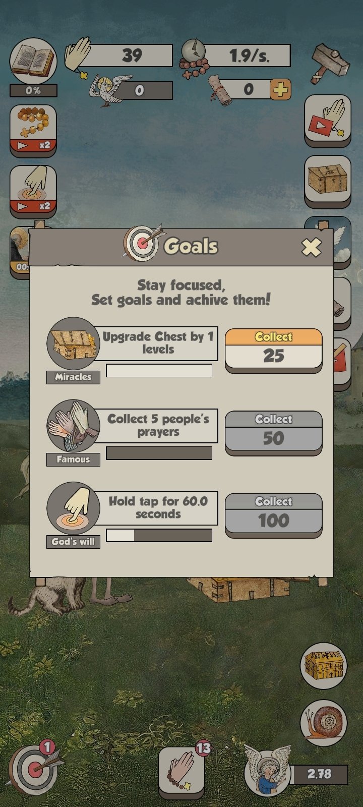 - Casual game with idle progression centered on prayer as the main mechanic.
