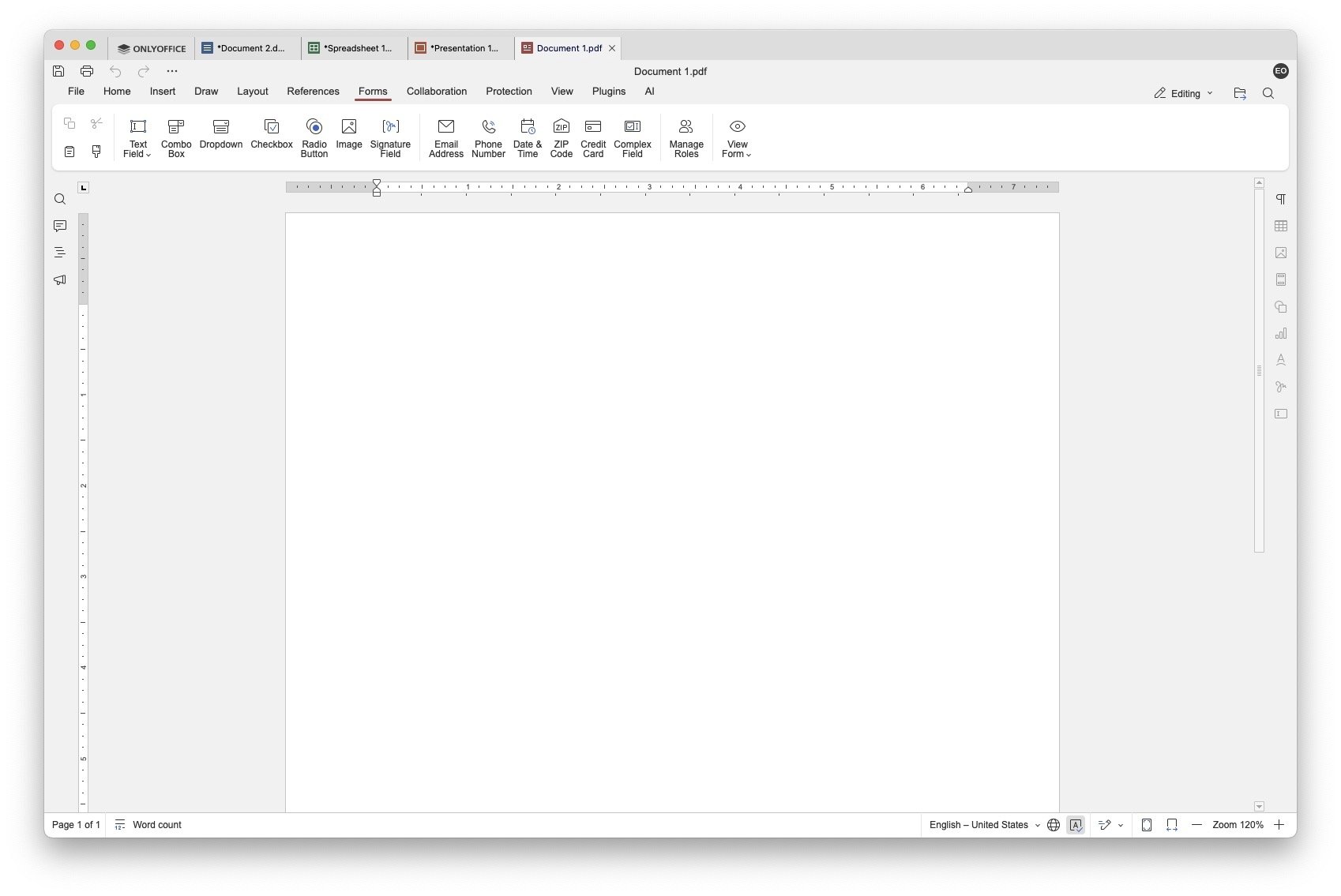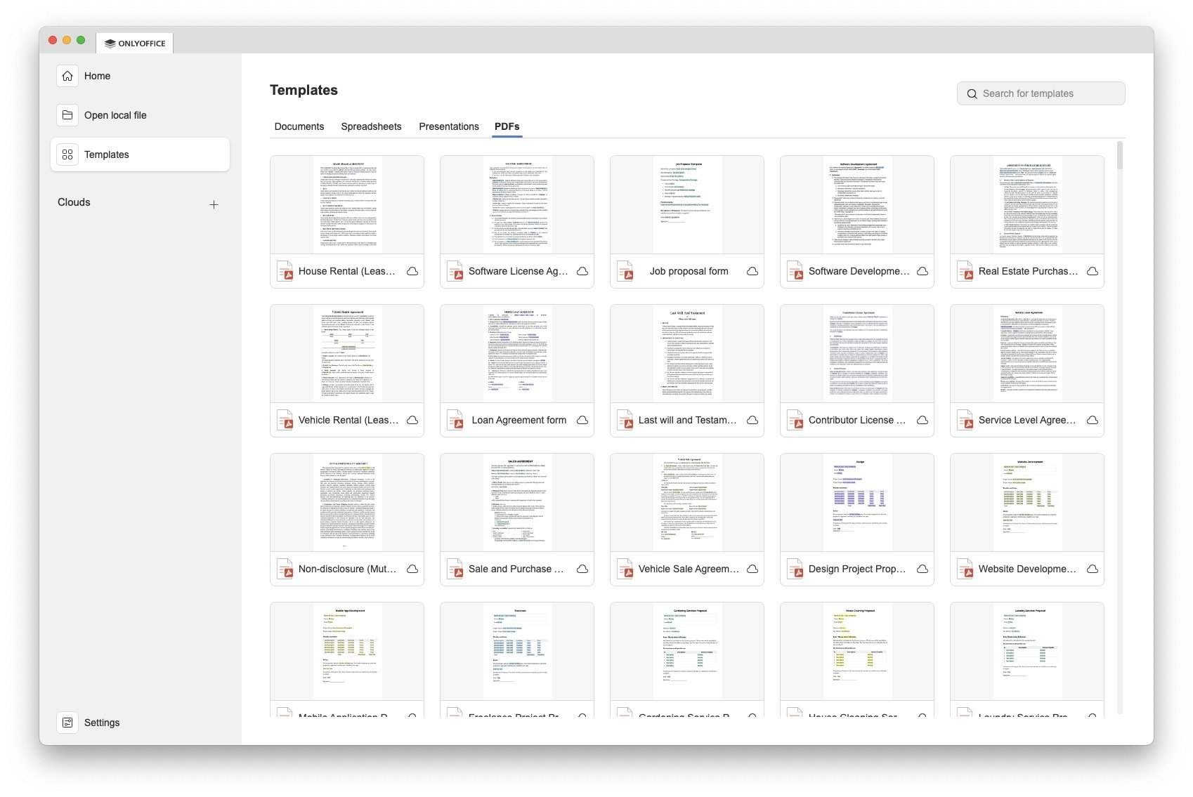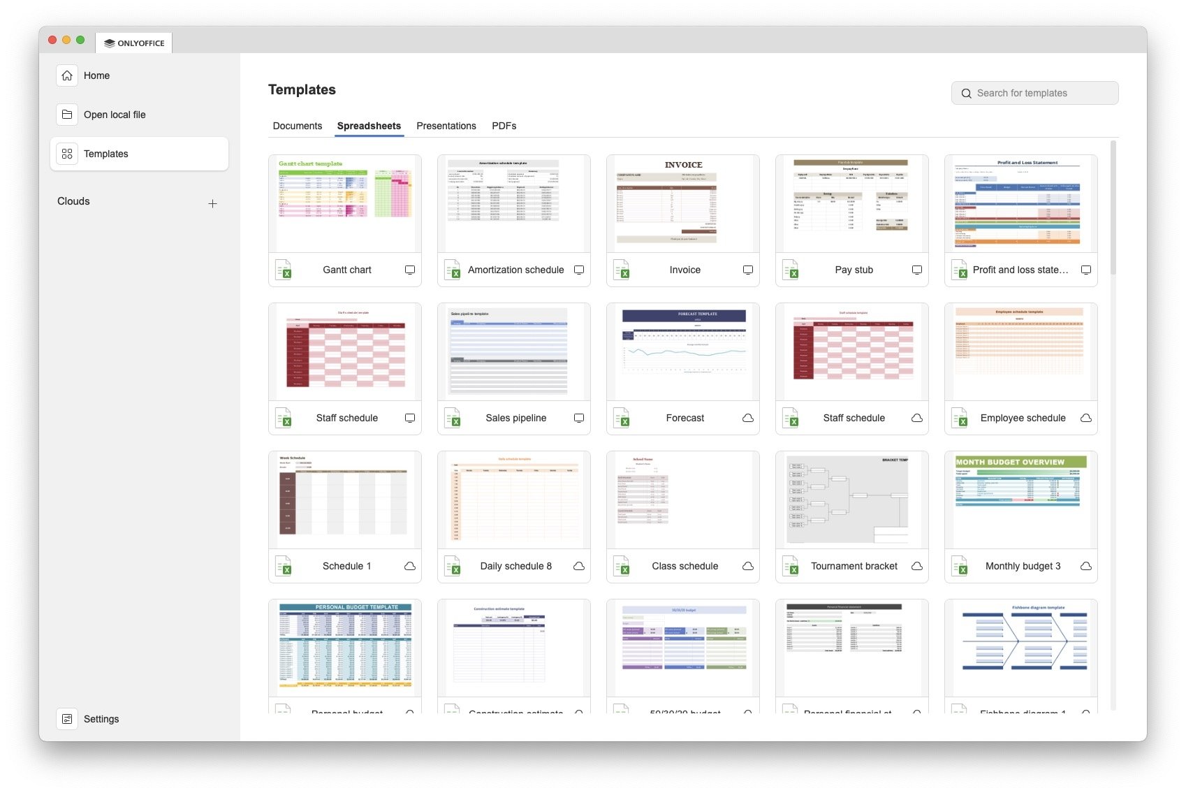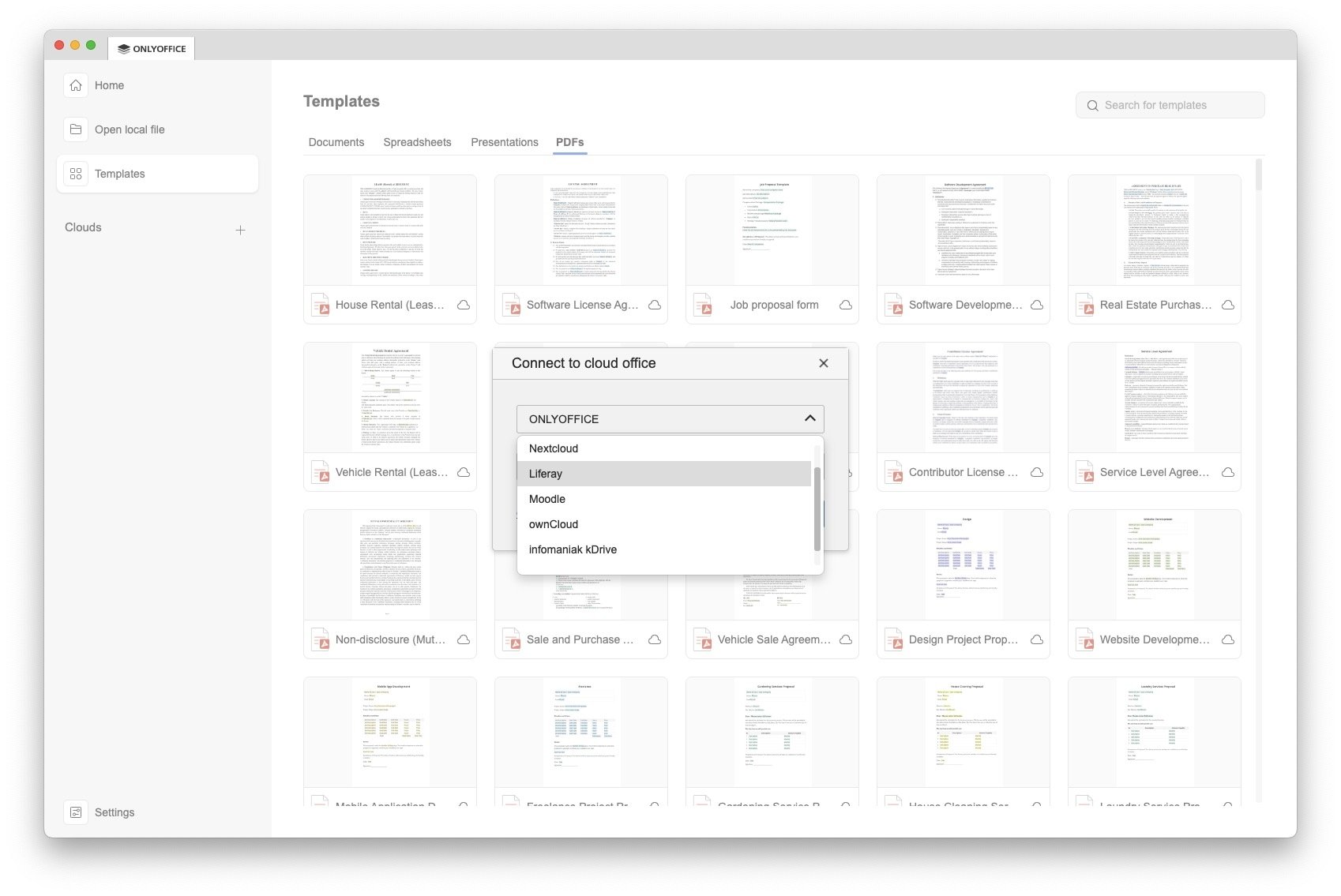 En macOS, ONLYOFFICE Desktop Editors incluye cuatro aplicaciones principales: Documentos, Hojas de cálculo, Presentaciones y Archivos PDF. Todas funcionan de forma muy similar a Word, Excel, PowerPoint y un programa de PDFs estándar, con una interfaz moderna y limpia. Además, se integra con la nube de OnlyOffice y con servicios externos como Nextcloud, ownCloud o infomaniak KDrive, lo que facilita trabajar en equipo sin importar la plataforma. Por supuesto, puedes usar cualquier otra nube sin integración, simplemente usando el cliente de sincronización propio.