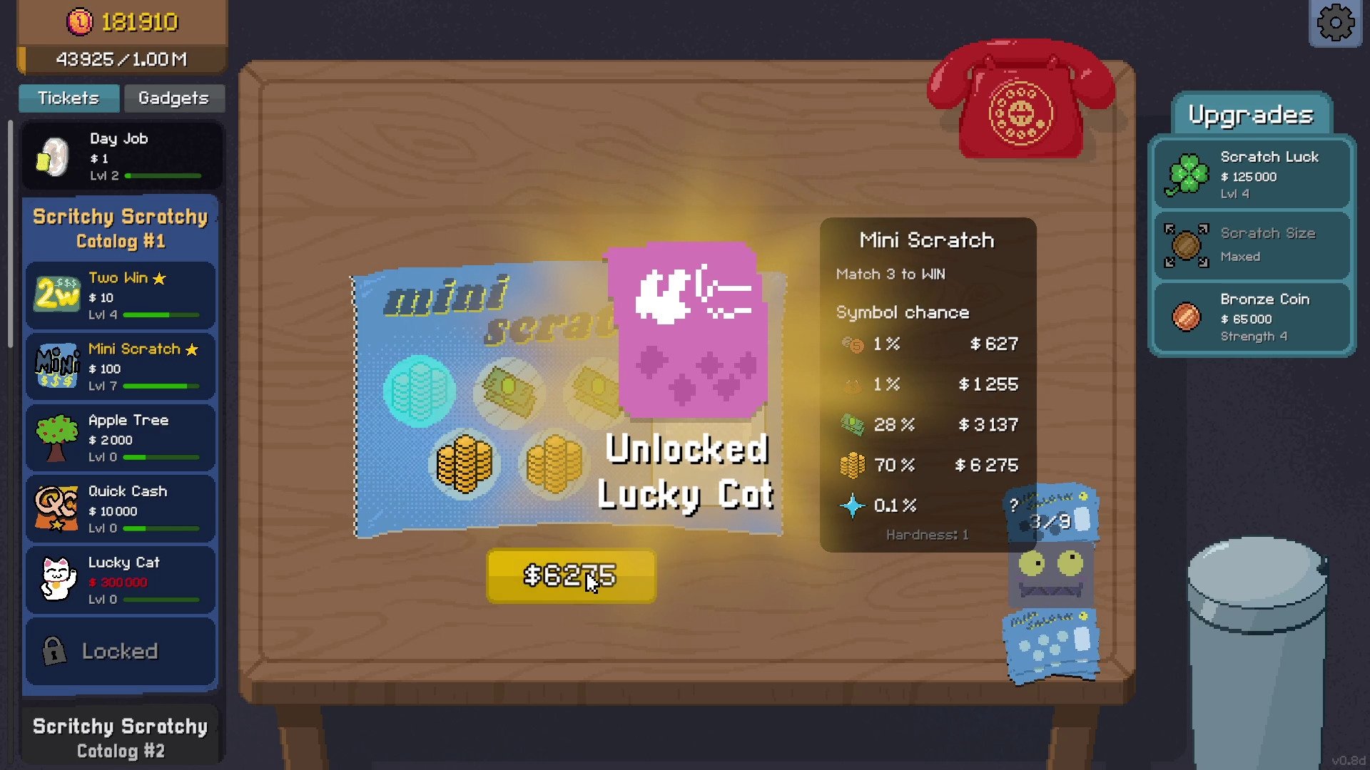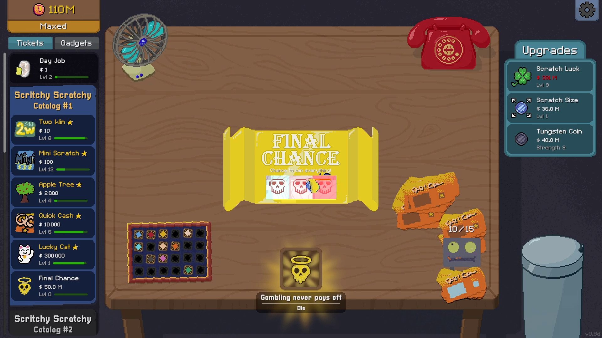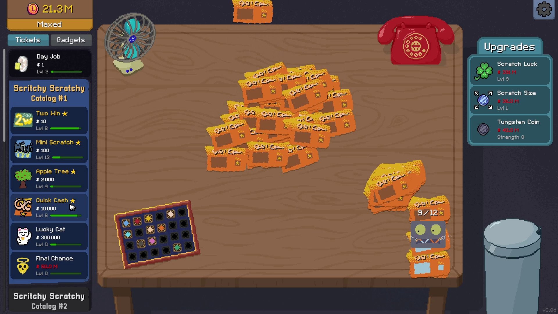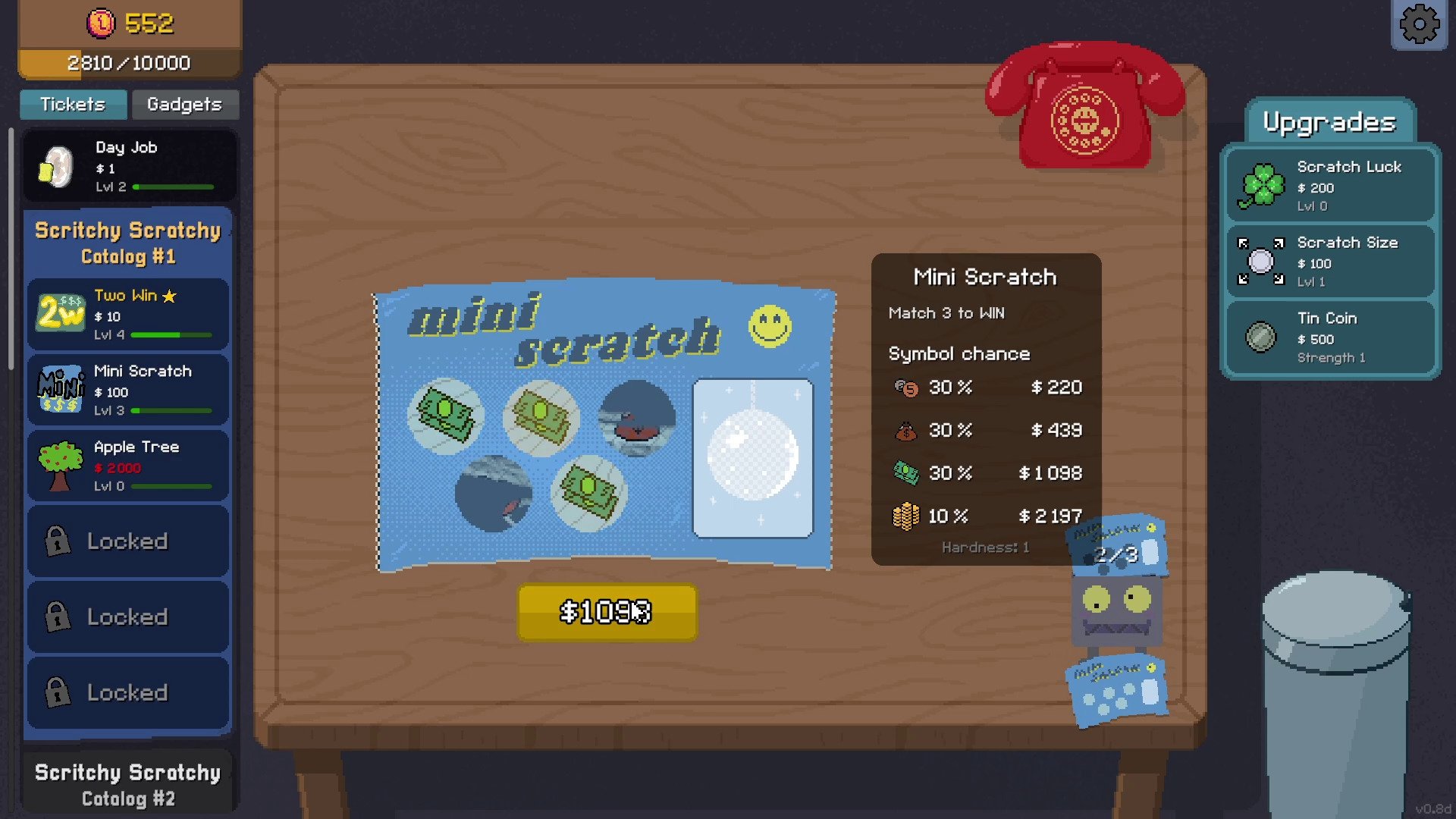 Scritchy Scratchy ofrece una experiencia incremental con un buen equilibrio entre riesgo y recompensa. Aunque sus gráficos son sencillos y la idea no es nueva (recuerda mucho a Balatro), el juego resulta muy entretenido gracias a su progresión constante y al agradable sonido al raspar. La duración es casi infinita, perfecta para quienes disfrutan de retos pausados y estratégicos.