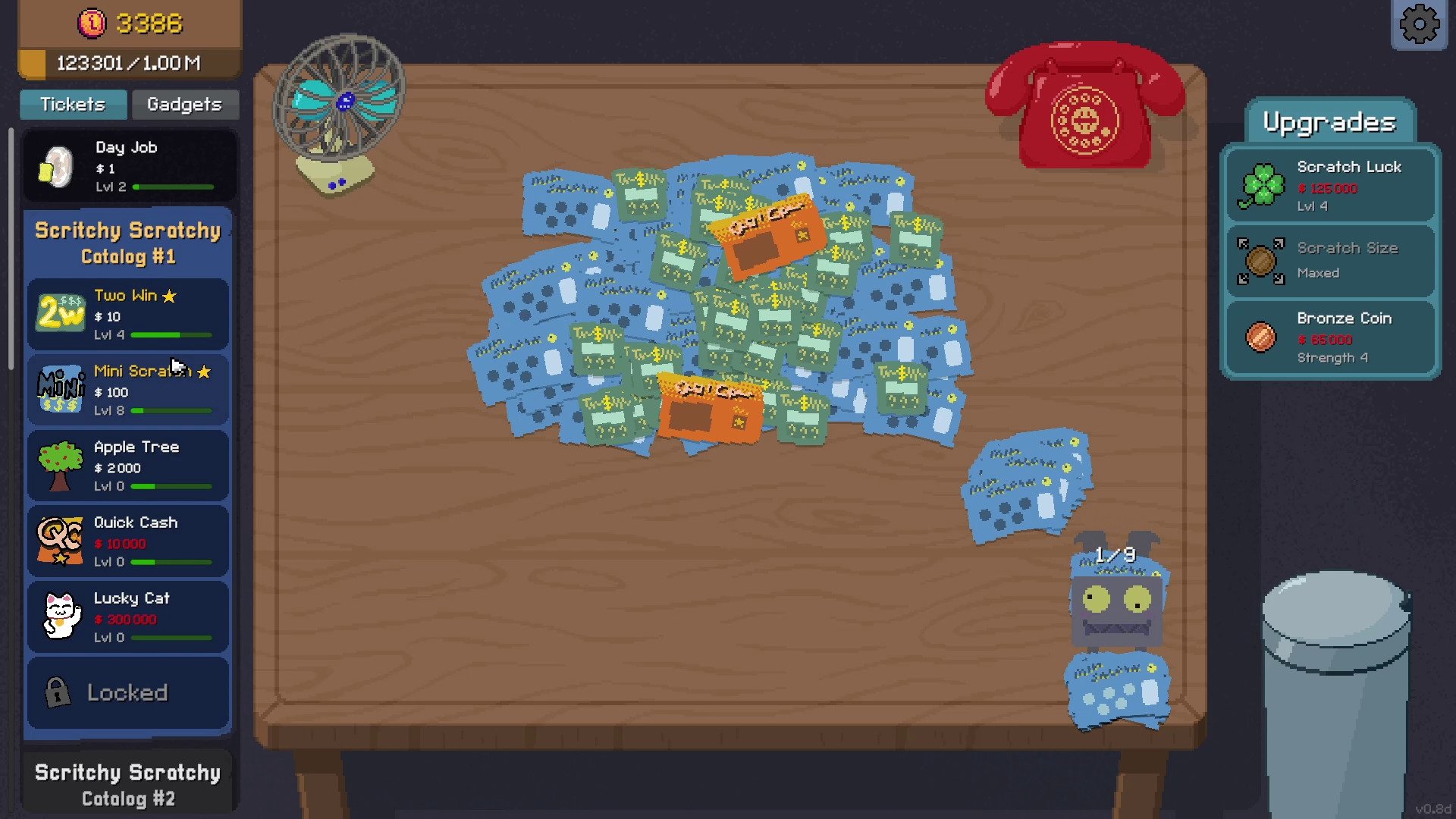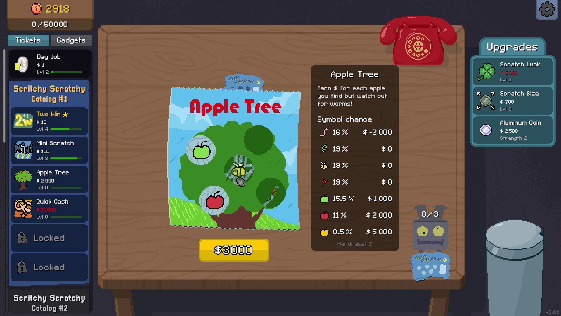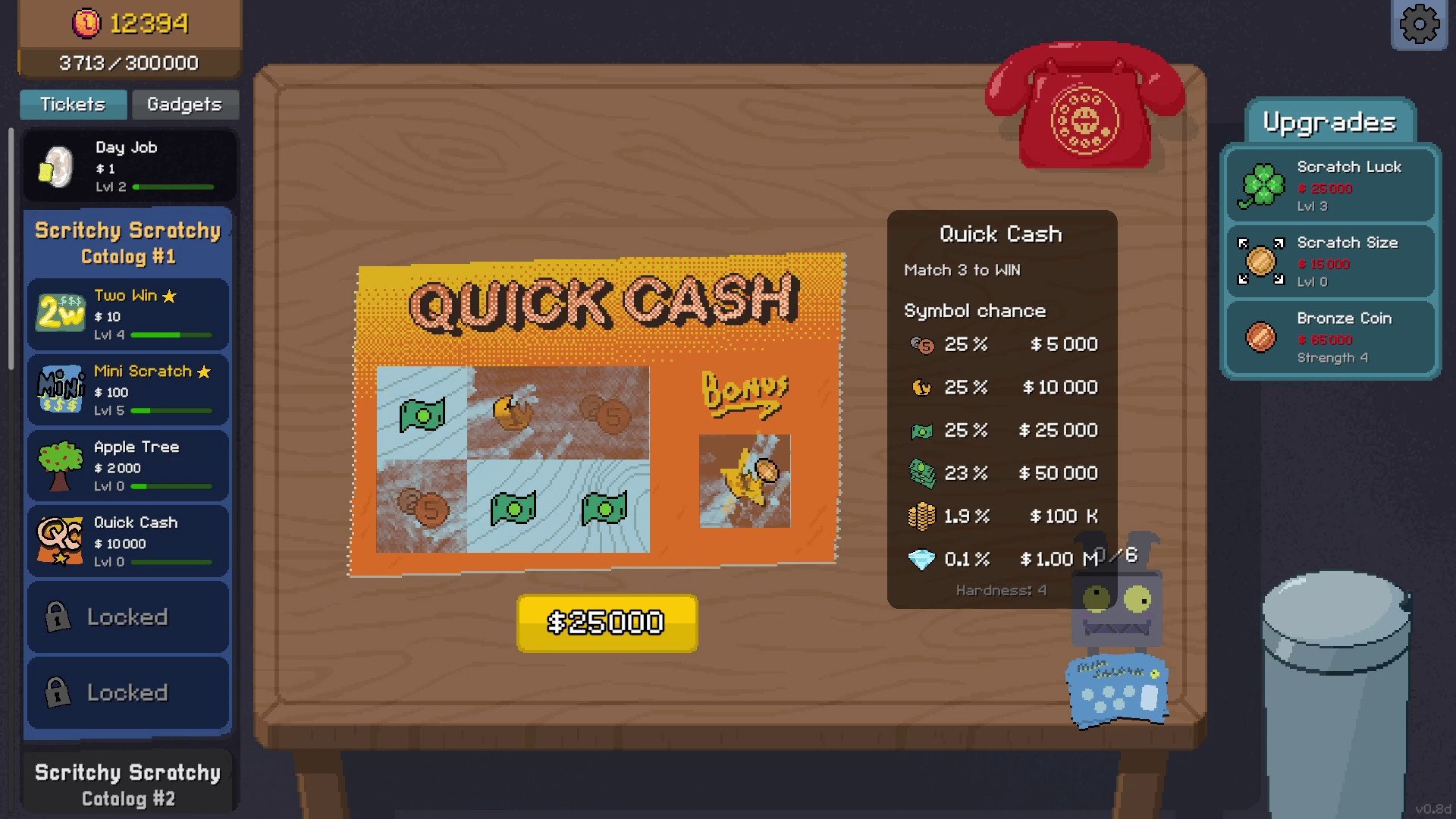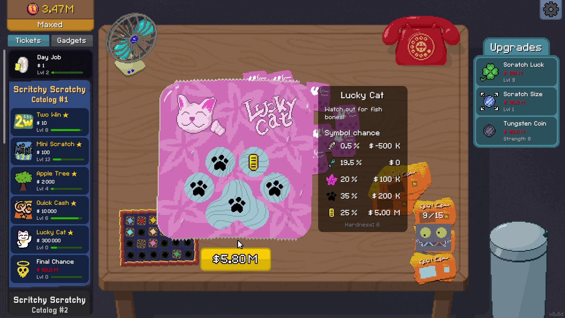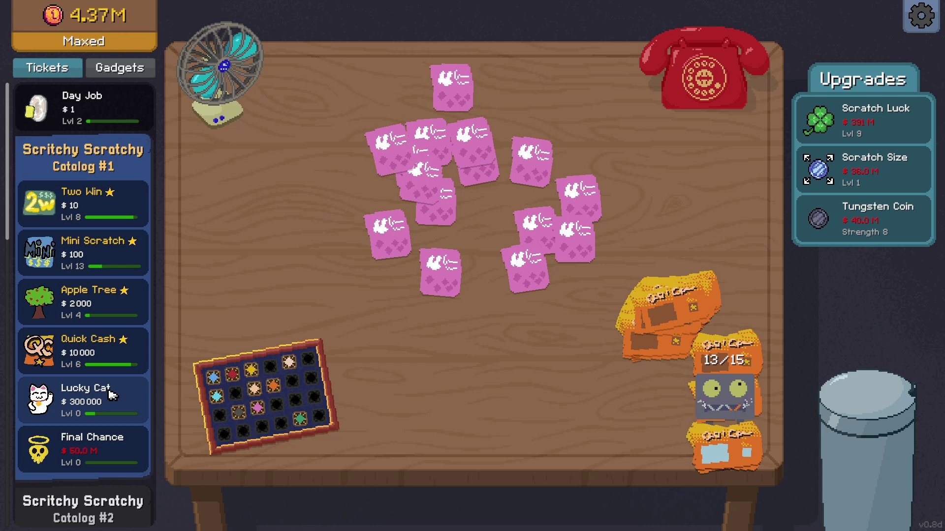 Scritchy Scratchy ofrece una experiencia incremental con un buen equilibrio entre riesgo y recompensa. Aunque sus gráficos son sencillos y la idea no es nueva (recuerda mucho a Balatro), el juego resulta muy entretenido gracias a su progresión constante y al agradable sonido al raspar. La duración es casi infinita, perfecta para quienes disfrutan de retos pausados y estratégicos.